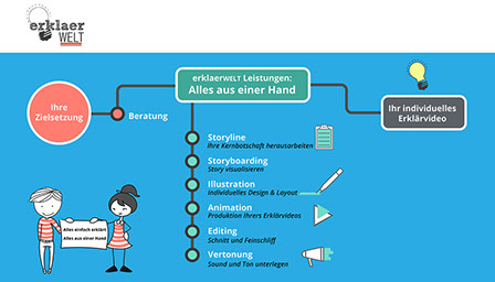 erklaerWELT bietet Ihnen alles aus einer Hand. Vom Storytelling und Storyboarding über die Entwicklung des Designs sowie der Animation und Produktion Ihres finalen Erklärvideos.